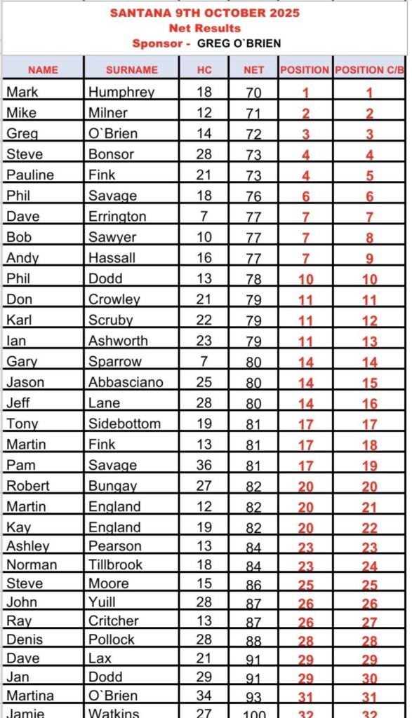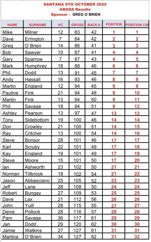 09-Oct-25 | Santana | Medal Gross | Mike Milner 83 | Dave Errington 84 | Greg O'Brien | Phil Dodd | |||